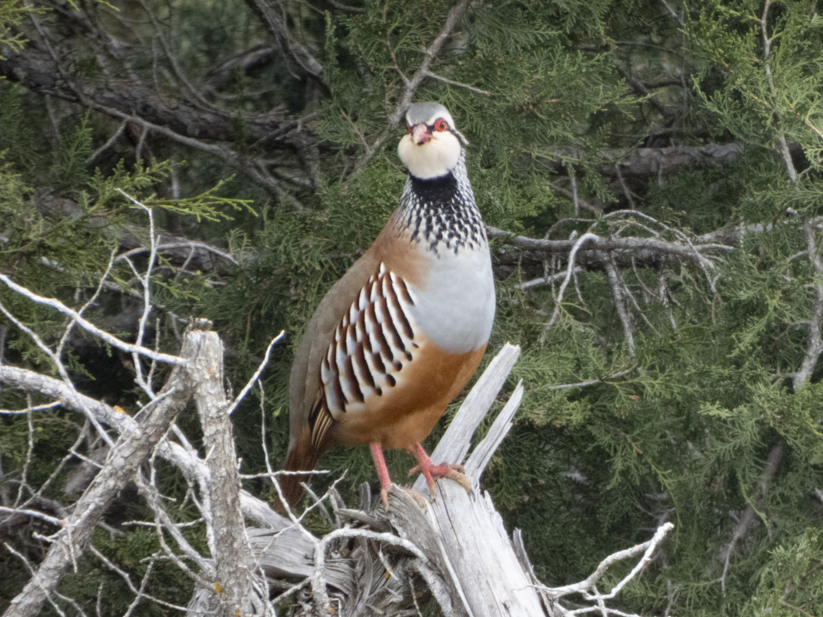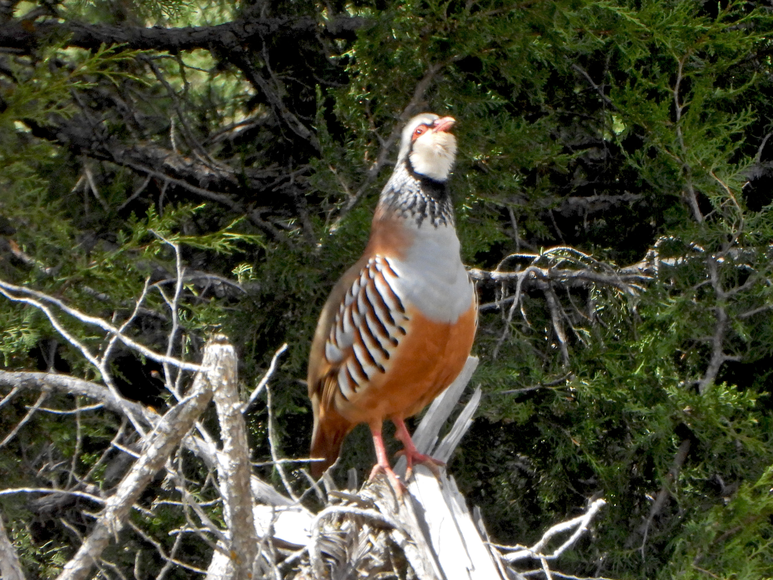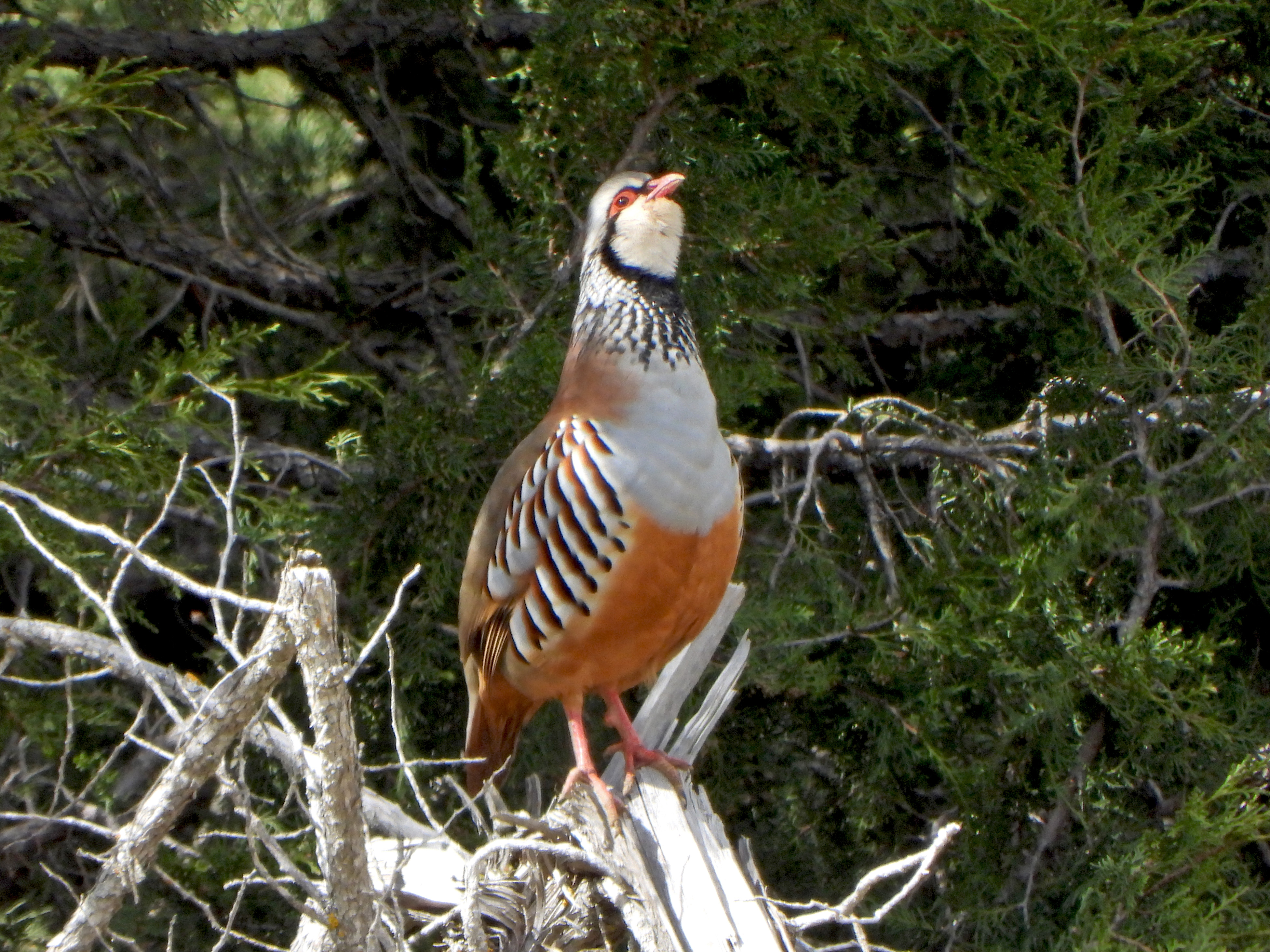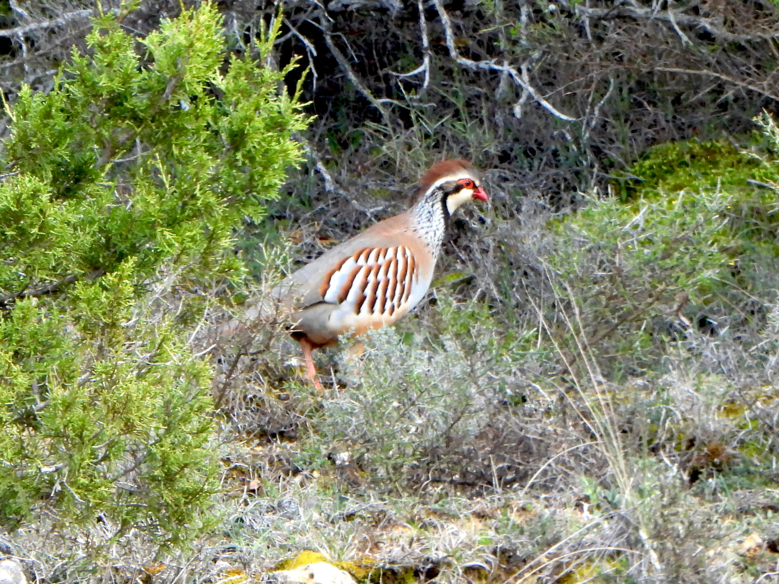 Continué con el coche camino del pantano con la simple intención subir hasta Cerrollaría y a la altura de Cerro Enmedio una pareja de perdices cruzó a peón el camino dirección al Castillejo, una de ellas se perdió entre los enebros y la otra quedó en la linde del sembrado como para comprobar si mi presencia era suficiente motivo para abandonar su territorio; sin parar el motor detuve el coche y bajé la ventanilla, saqué la cámara que llevaba en la mochila sobre el asiento del acompañante y ahí seguía el macho desafiante como pude comprobar por el visor al apreciar su píleo erizado en actitud hostil. Tras dos o tres disparos (con la cámara), el animal receloso de que alguien mucho más grande pudiera buscarle un problema siguió su camino por donde un minuto antes lo había hecho su hembra. Si bien la foto no era nada del otro jueves, esta irrupción me recordó que estábamos en plena época de celo para la alectoris rufa -la perdiz de toda la vida- y no sería extraño que precisamente en Cerrollaría pusiese observar alguna pareja más.