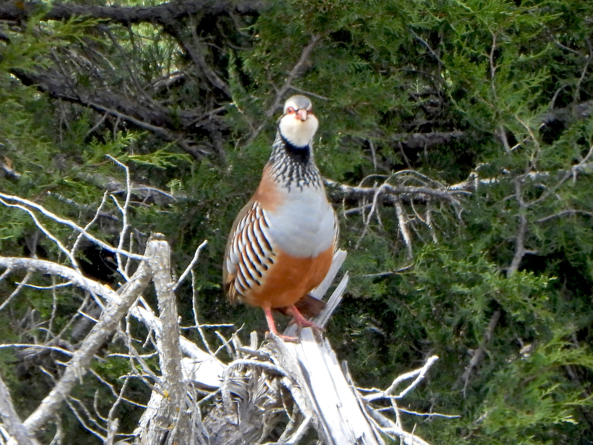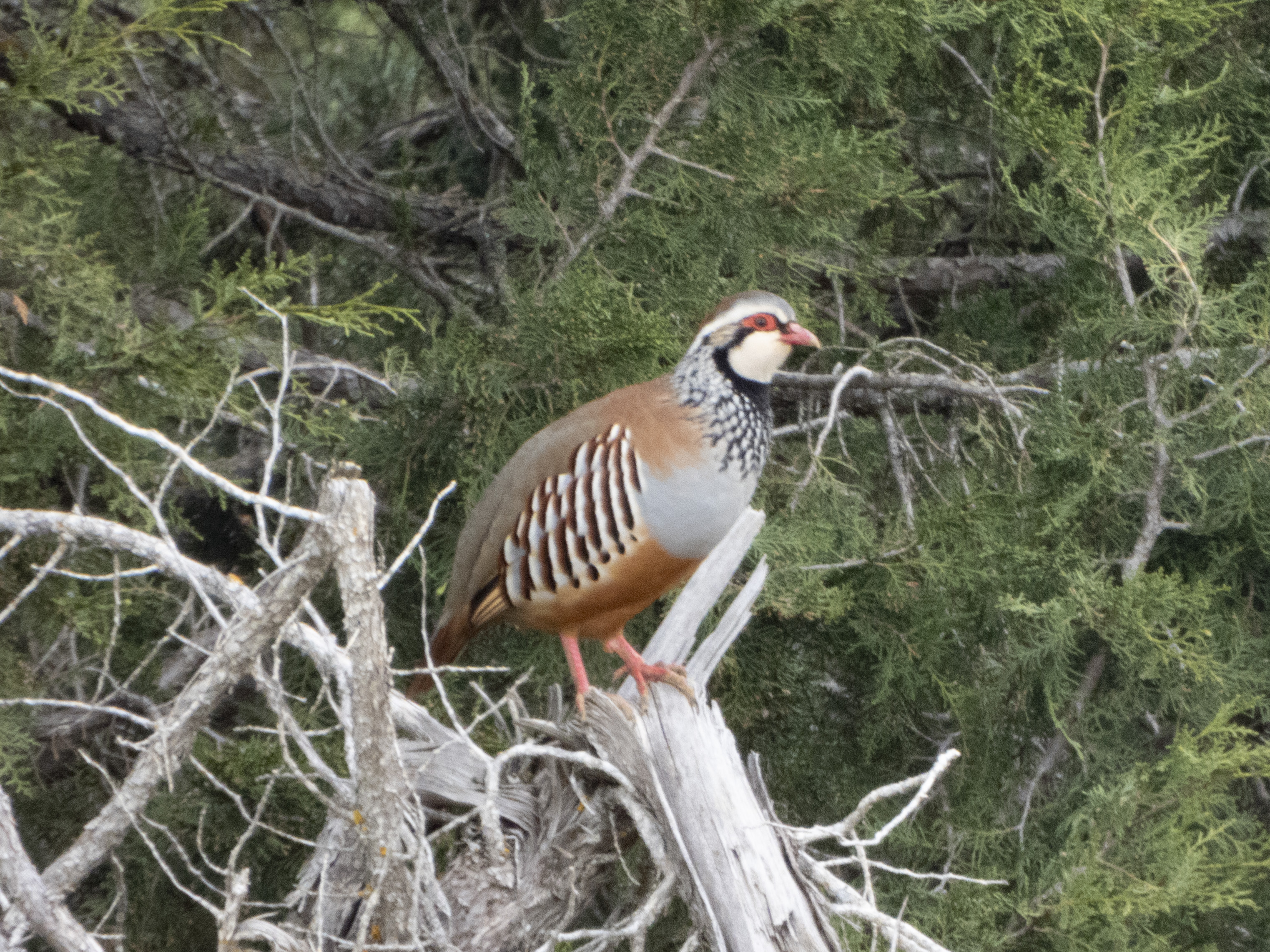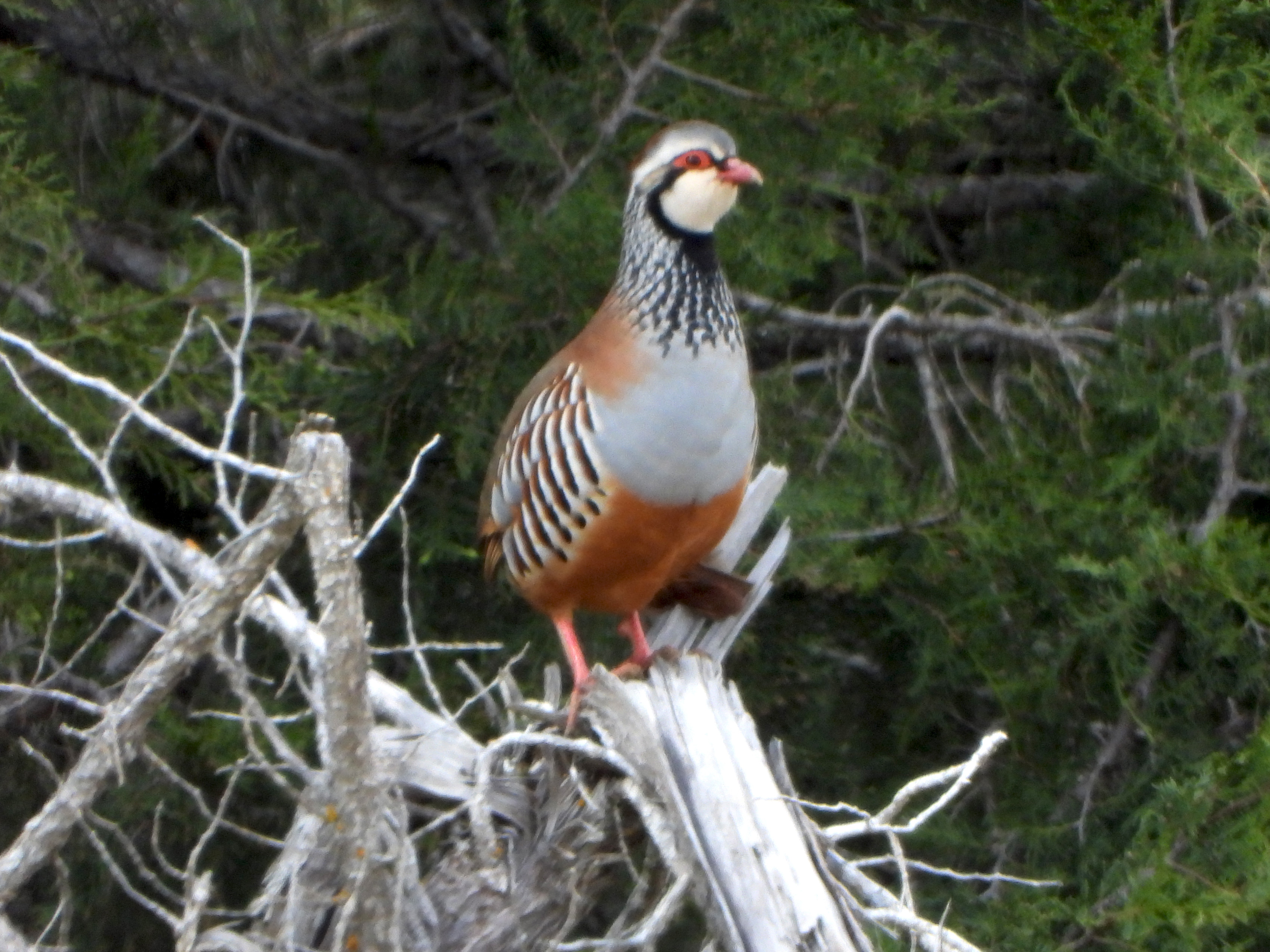 Continué con el coche camino del pantano con la simple intención subir hasta Cerrollaría y a la altura de Cerro Enmedio una pareja de perdices cruzó a peón el camino dirección al Castillejo, una de ellas se perdió entre los enebros y la otra quedó en la linde del sembrado como para comprobar si mi presencia era suficiente motivo para abandonar su territorio; sin parar el motor detuve el coche y bajé la ventanilla, saqué la cámara que llevaba en la mochila sobre el asiento del acompañante y ahí seguía el macho desafiante como pude comprobar por el visor al apreciar su píleo erizado en actitud hostil. Tras dos o tres disparos (con la cámara), el animal receloso de que alguien mucho más grande pudiera buscarle un problema siguió su camino por donde un minuto antes lo había hecho su hembra. Si bien la foto no era nada del otro jueves, esta irrupción me recordó que estábamos en plena época de celo para la alectoris rufa -la perdiz de toda la vida- y no sería extraño que precisamente en Cerrollaría pusiese observar alguna pareja más.