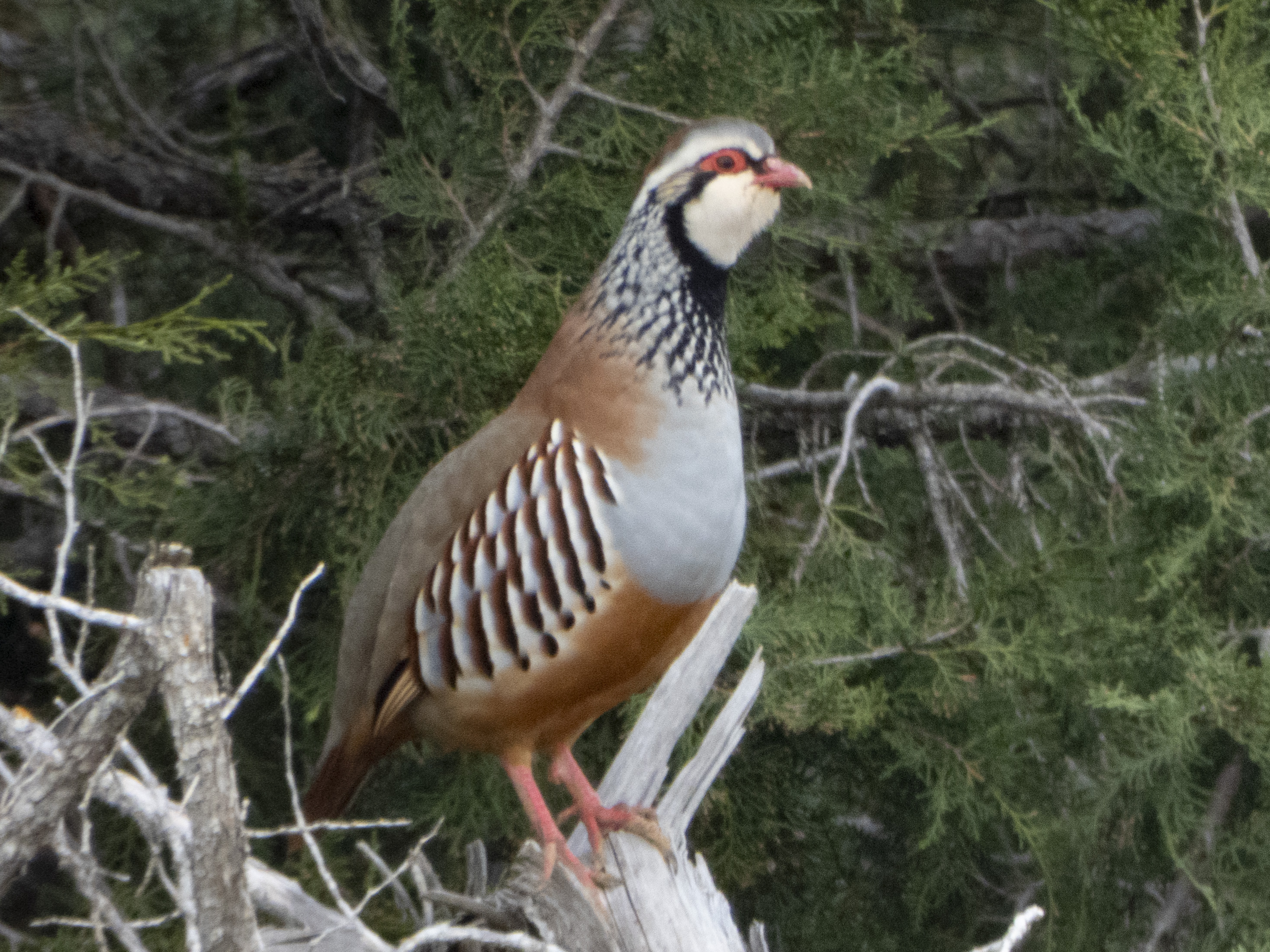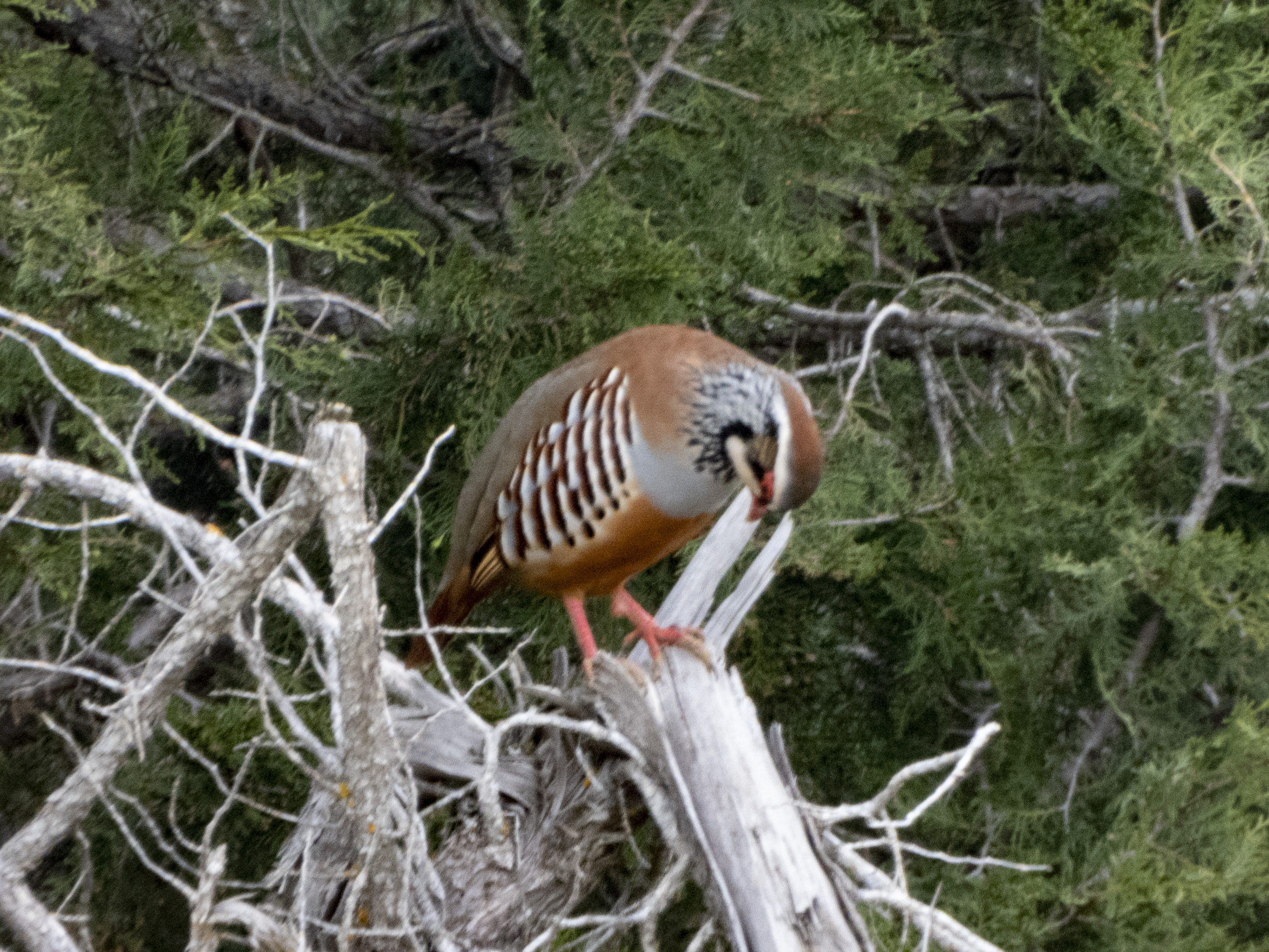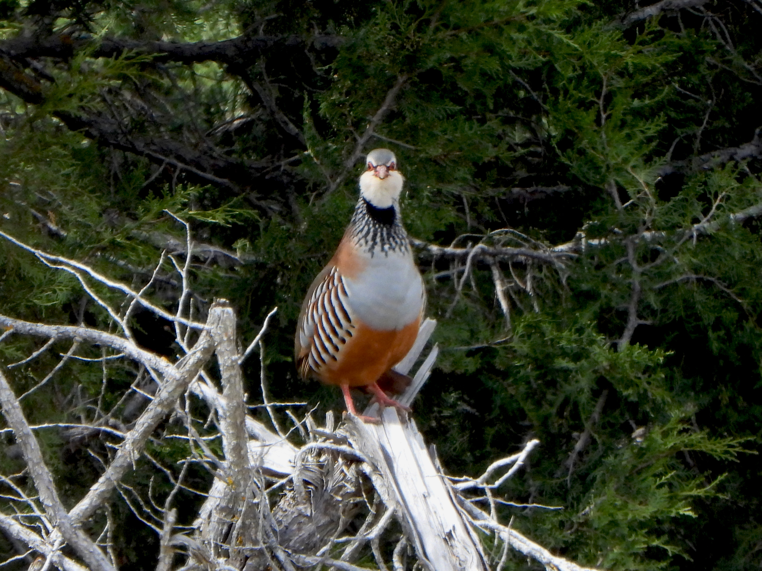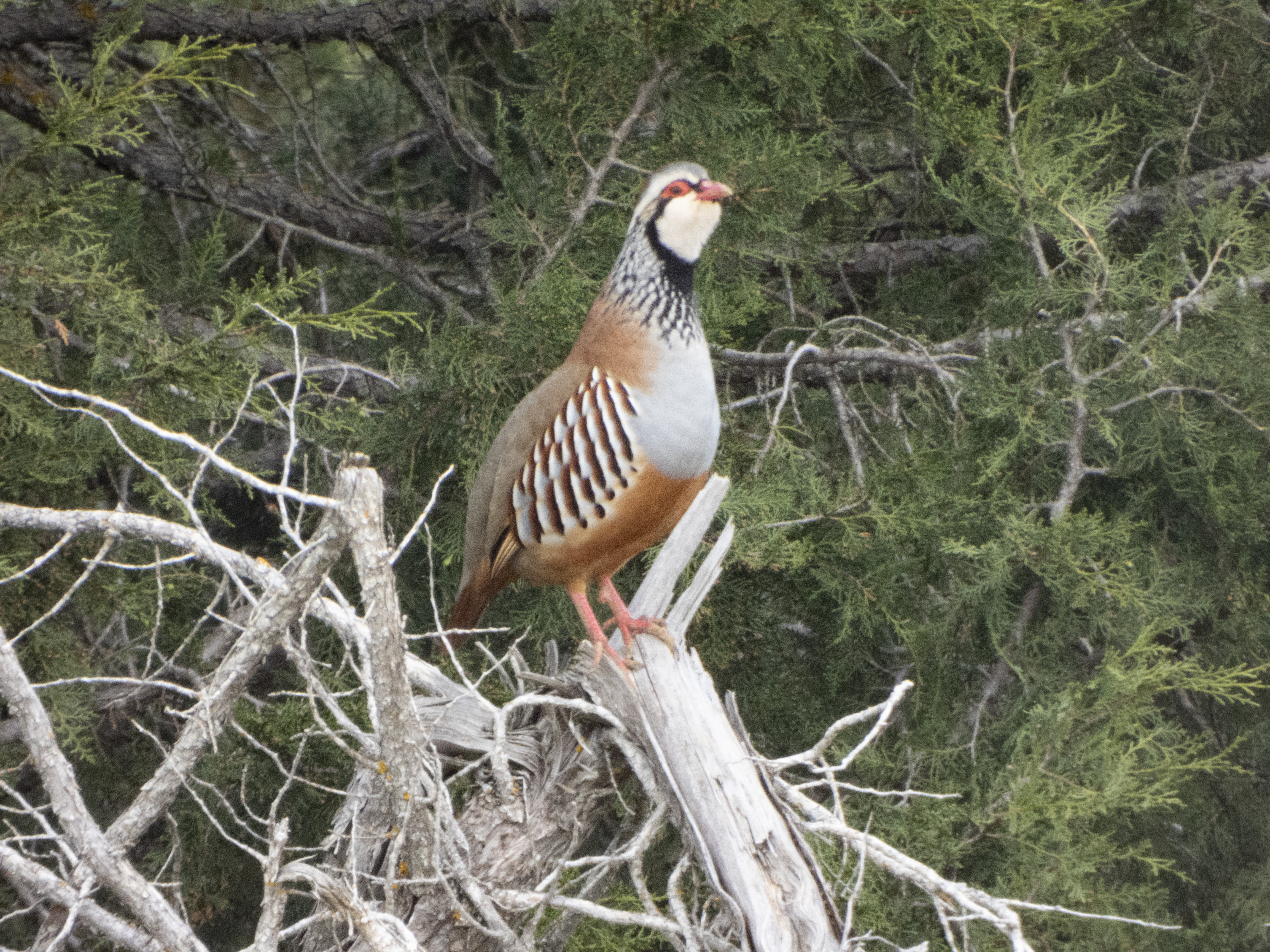 Continué con el coche camino del pantano con la simple intención subir hasta Cerrollaría y a la altura de Cerro Enmedio una pareja de perdices cruzó a peón el camino dirección al Castillejo, una de ellas se perdió entre los enebros y la otra quedó en la linde del sembrado como para comprobar si mi presencia era suficiente motivo para abandonar su territorio; sin parar el motor detuve el coche y bajé la ventanilla, saqué la cámara que llevaba en la mochila sobre el asiento del acompañante y ahí seguía el macho desafiante como pude comprobar por el visor al apreciar su píleo erizado en actitud hostil. Tras dos o tres disparos (con la cámara), el animal receloso de que alguien mucho más grande pudiera buscarle un problema siguió su camino por donde un minuto antes lo había hecho su hembra. Si bien la foto no era nada del otro jueves, esta irrupción me recordó que estábamos en plena época de celo para la alectoris rufa -la perdiz de toda la vida- y no sería extraño que precisamente en Cerrollaría pusiese observar alguna pareja más.