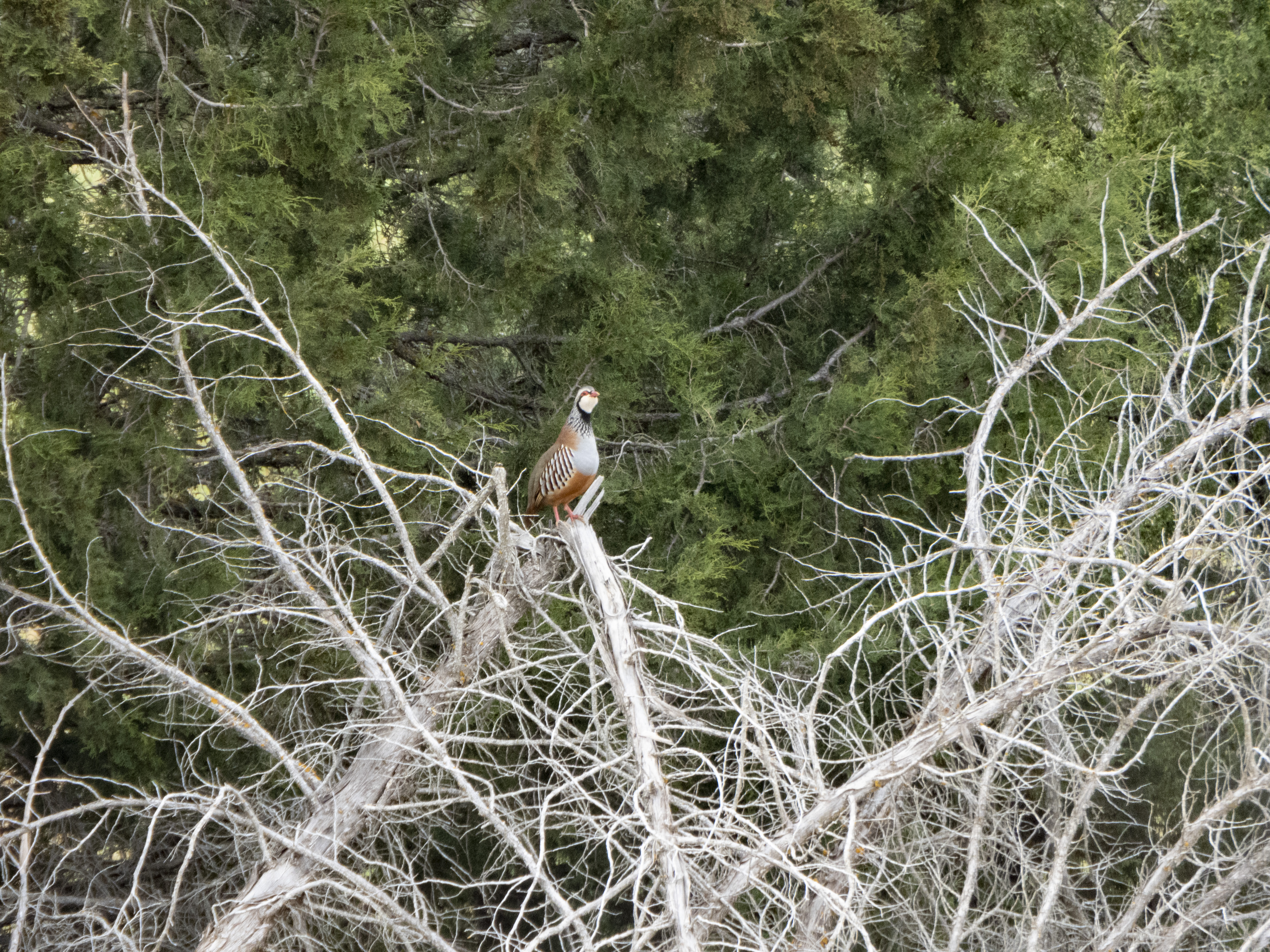 Al llegar a la fuente de los Chopos paré el coche, saqué la cámara y también comprobé si en el teléfono llevaba grabado el canto de un macho en celo; al probarlo junto al coche donde aparqué por si más tarde podía forzar una mejor pose del animal provocándole como si fuera un competidor de su especie, en apenas unos segundos pude ver como salió del monte bajo un macho completamente indignado y corriendo (a peón) se dirigía sobre un sembrado a toda velocidad en dirección hacia mí y cuando creía que acabaría viéndome en cuanto se acercase un poco, levantó un vuelo corto pero no para marcharse sino para desde el alto de las ramas de una sabina seca otear mejor dónde podía encontrarse su contrincante. No había tiempo para nada, así que agarré la cámara y una bufanda mimética e improvisé un camuflaje tras unas matas de sabina no demasiado frondosa. Ni en el mejor de los casos esperaba que este animal aguantase todo el tiempo que permaneció allí.