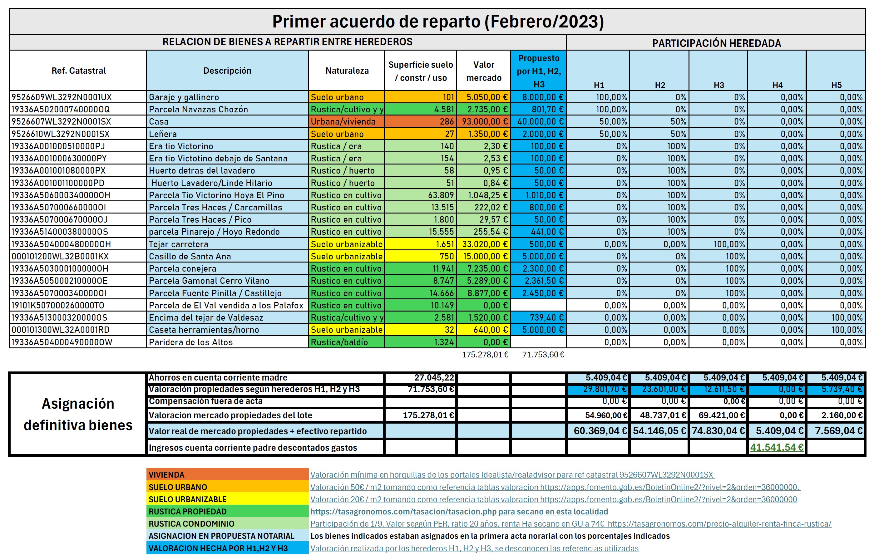 «Vaya trabajazo que has hecho» , le decía durante el primer reparto el heredero H1 al H3 y no le faltaba razón; el H3 que en principio lo coordinaba, le adjudicaba al H1 como era su deseo el 50% de una casa que convencionalmente con la aceptación del resto valoraban en un total de 40.000€, además de la mitad de la leñera, el garaje del tractor y uno de los piazos-basura que nadie quería y nos repartimos por sorteo con participación forzosa para cuatro de los cinco coherederos. El lote H1 ascendía a un valor de mercado de unos 55.000€, valoración que redujo unilateralmente a efectos de hacer las compensaciones a unos 26.000€. Mientras el H3 se auto preasignaba prácticamente todas las tierras y los dos mejores solares y únicos donde se podía construir, sumando una valoración real de mercado de unos 70.000€, que sin embargo el adjudicador/adjudicatario autovaloraba a efectos de compensación en 15.314€; lo que le daba derecho a llevarse además 3.548,8€ de dinero en efectivo hasta llegar a los 18.862,8€ que se suponía tendría que valer cada uno de los cinco lotes.