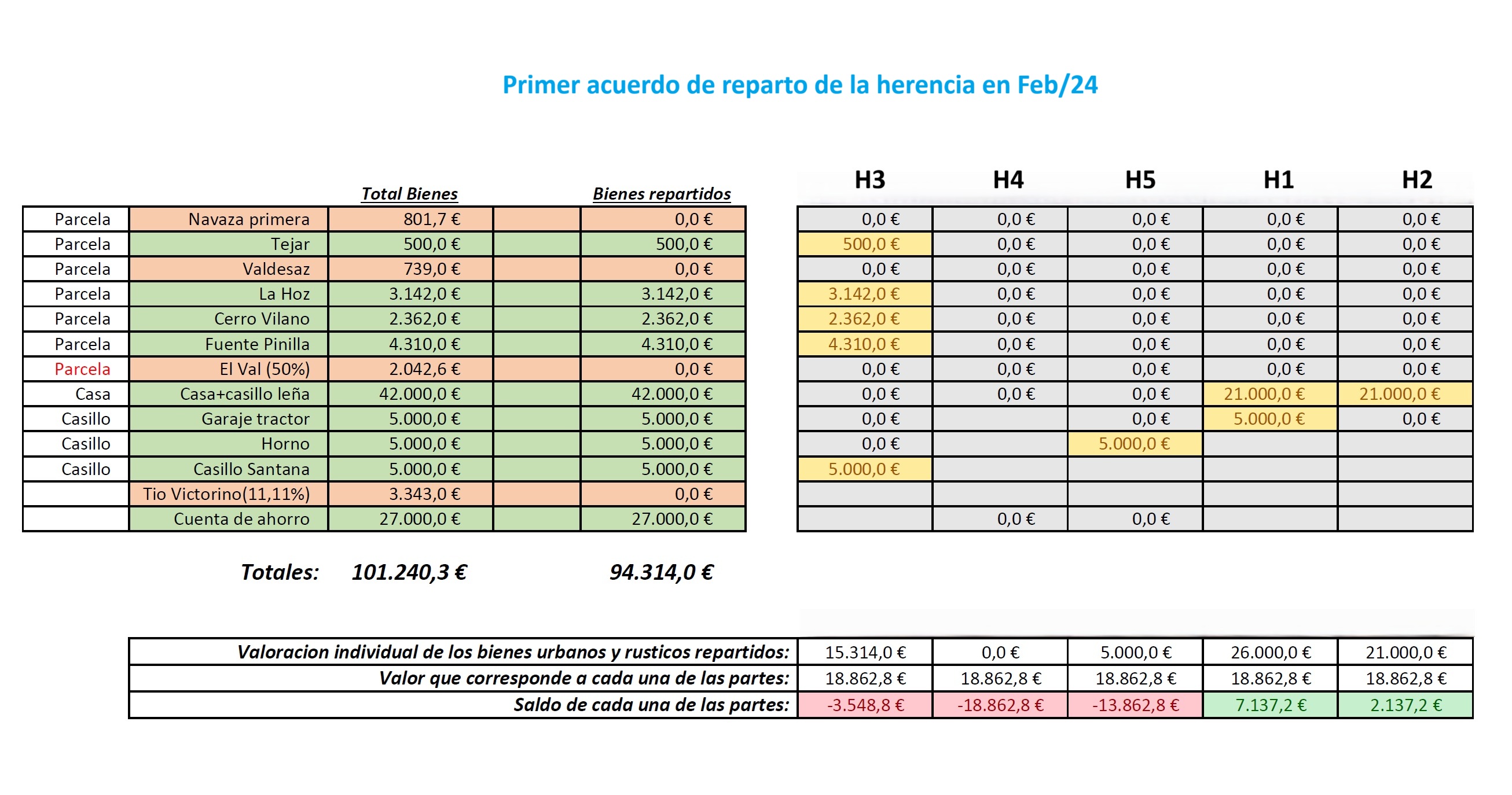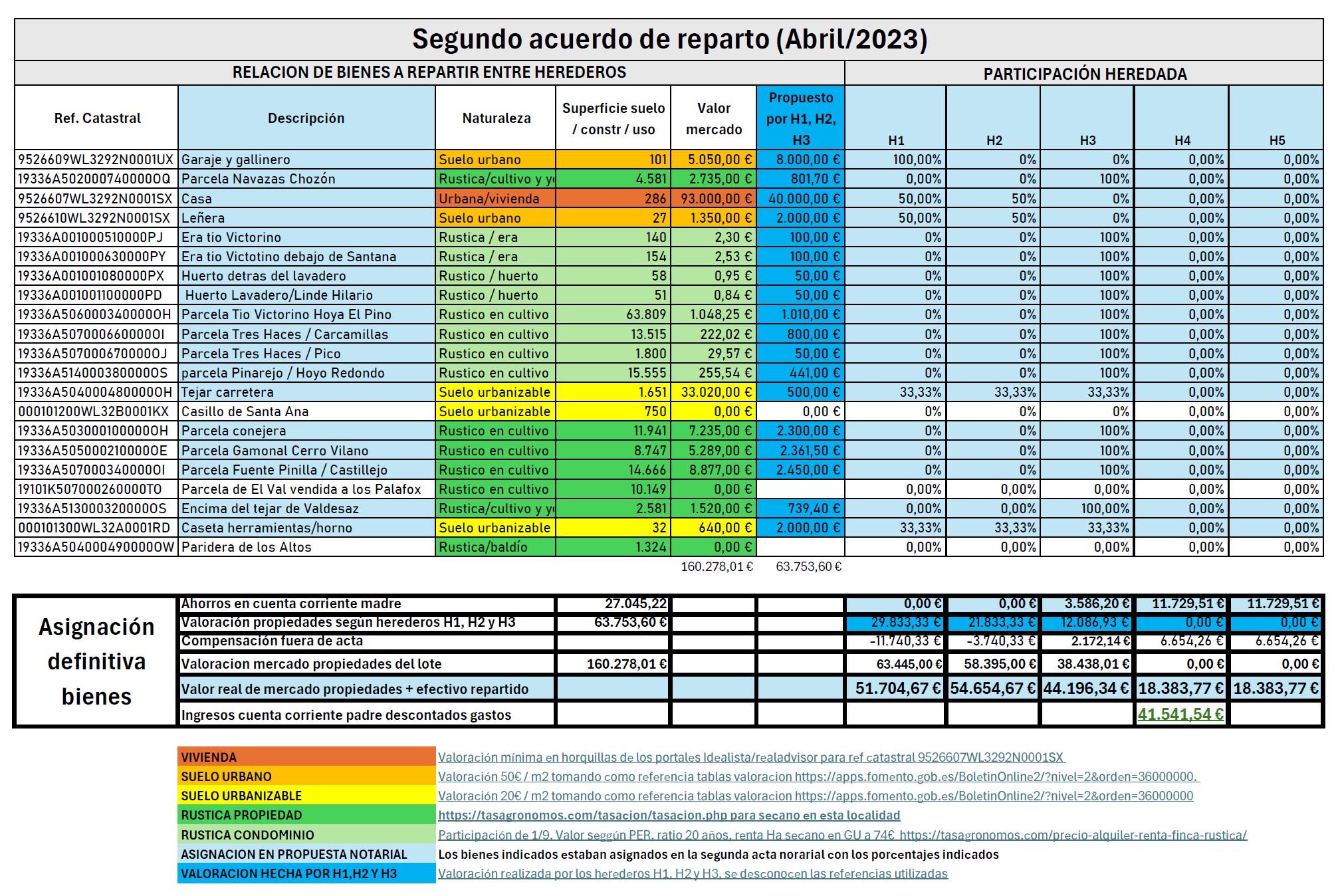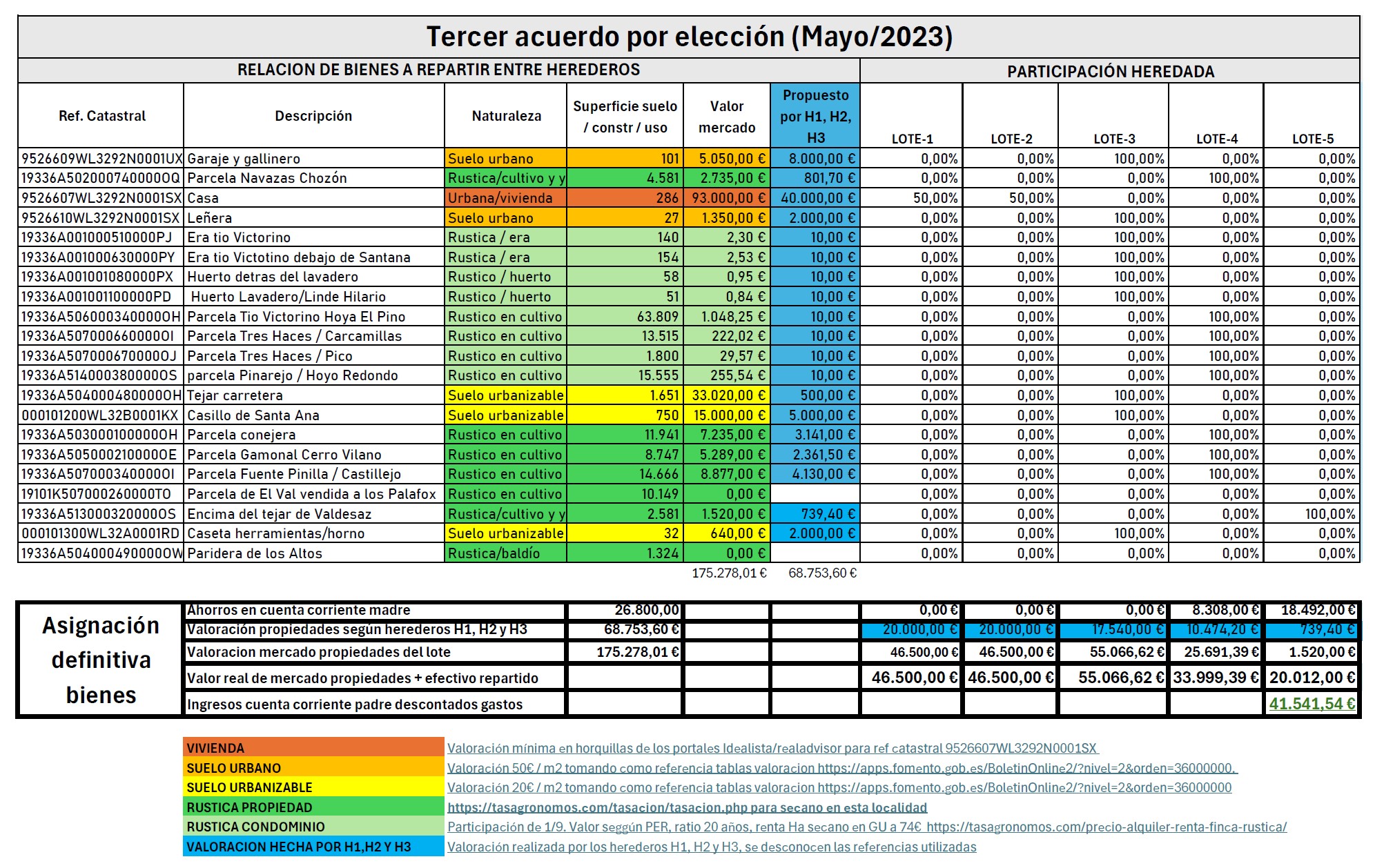 Pero los hechos son los que son: en el primer intento acepté un lote en que en realidad no me llevaba nada porque las obligaciones de gasto apenas se cubrían con los 13.000€ de efectivo que me llevaba y las dos peores propiedades del patrimonio impuestas no valían ni para regalarlas, mientras los que se llevaban media casa o prácticamente el resto de todas las demás propiedades, sus lotes superaban en el peor de los casos los 50.000€. En el segundo intento de reparto, el lote que acepté era de unos 18.000€ en efectivo, pero ese valor era prácticamente 1/3 de cada uno de los de propiedades y aun así lo aceptaron a regañadientes, tanto que al final no se firmaría y a día de hoy no sé si fue solo la persona que decían que se echó atrás o en realidad fueron todos los que este reparto no les resultaba tan ventajoso.