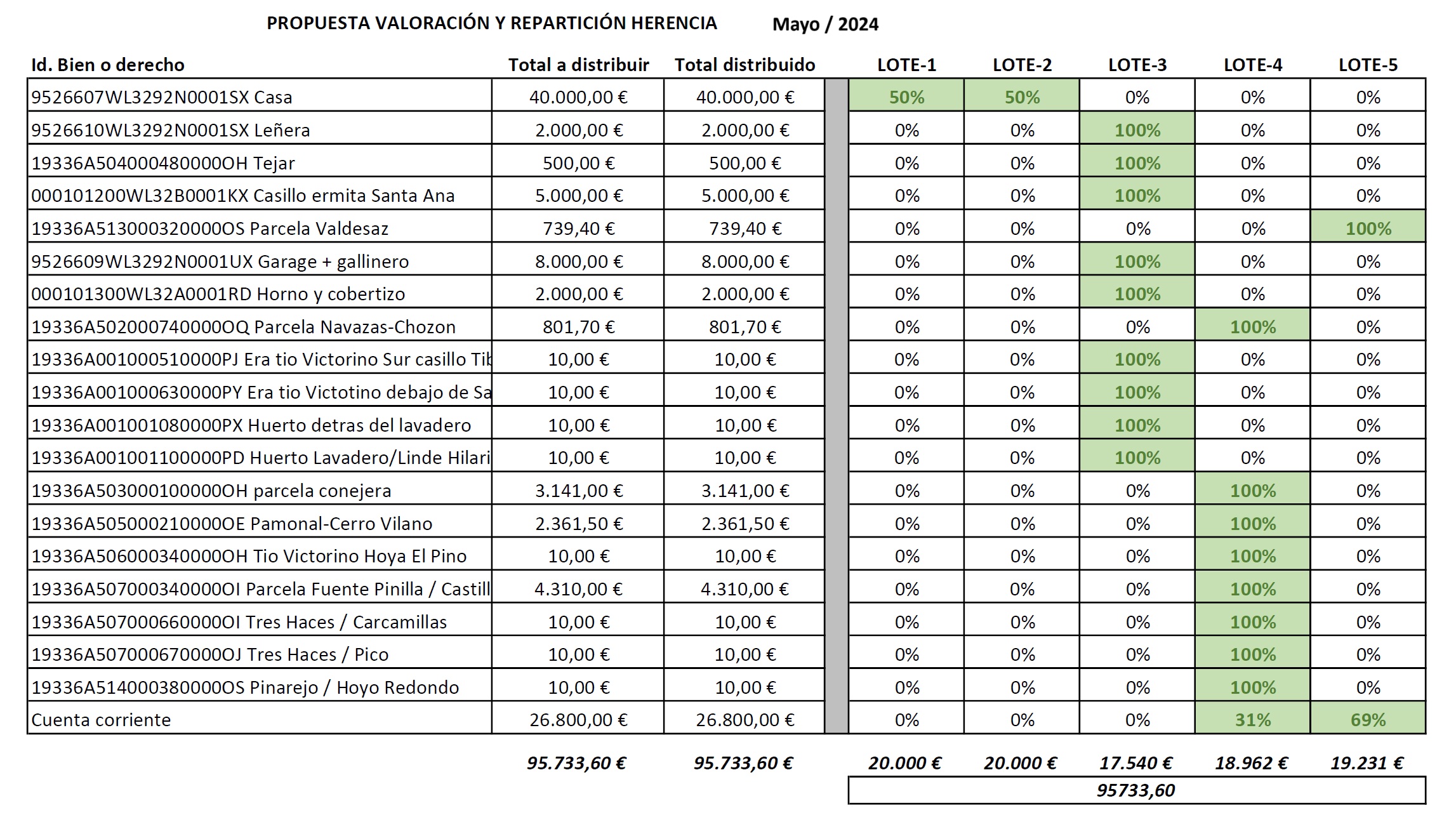 Lejos de parecerles leonino este reparto, todavía había una sorpresa preparada: a finales de febrero de 2024 se nos remitía la propuesta del acta notarial y si bien la titularidad de los bienes con muchos errores de identificación era más o menos la acordada, no se contemplaba ninguna compensación económica para los lotes de menor valor y los 27.000€ de los ahorros de la madre (los 41.000€ que le habían quedado al padre de su pensión después de descontar los gastos de la residencia se había sumido en una cuenta corriente en la que estaba al menos el heredero H4), se repartían entre los cinco a partes iguales como única compensación, quedándome como única herencia los 5.409,04€ de los ahorros de la madre y la adjudicación de la caseta de la mordida con lo que ahora sí que con toda seguridad me quedaba un compromiso de gasto mucho mayor que el dinero percibido, es decir, heredaba una deuda, mientras que a los adjudicatarios de los tres lotes de mayor valor, les incrementaba la asignación de efectivo quedando sus lotes entre los 54.000€ a 74.000€.