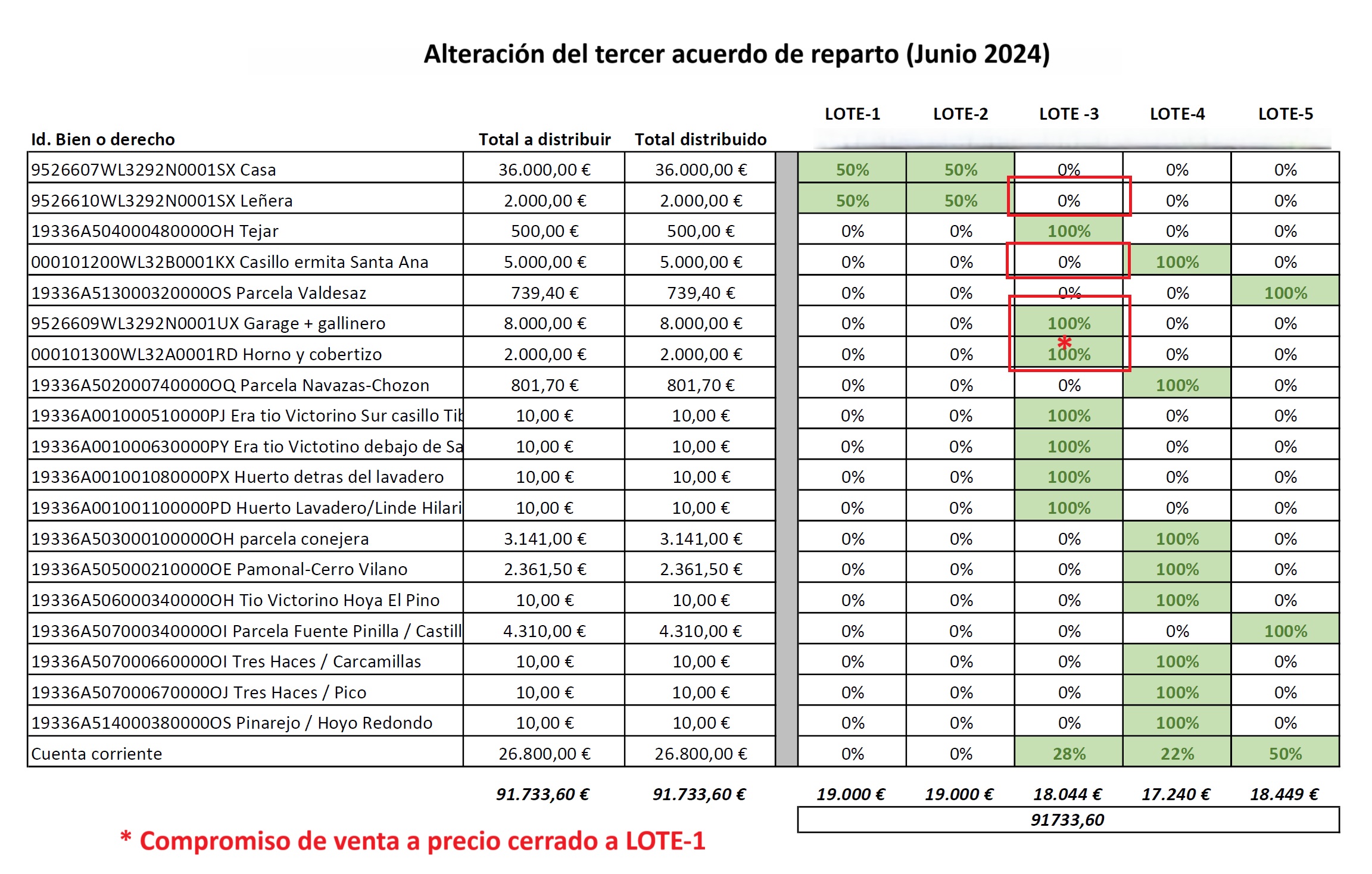 Pasados unos días, a final de mayo de 2024 dieron a luz la criatura y era más de lo mismo. Se seguían negando a hacer dos lotes de compensación económica por muy baratos que resultaran sabiendo que los dos que pediríamos primero las preferíamos, además se olvidaron de regular quien pedía primero con lo cual, dejando que lo hiciera la que exigía su lote en efectivo evitaban que mandara de nuevo el reparto al garete si no se lo llevaba. Tampoco tenía sentido que yo reclamara para que se estableciera un orden aleatorio de elección porque parece arraigado en la familia admitir los sorteos sin problemas, pero asumir el resultado solo se hace si te va bien, es decir, me quedaría sin compensación en efectivo de cualquier manera. Tocaba apechugar de nuevo e intentar acabar con aquella charlotada que desde luego iba a ser la última, así que siendo el segundo en elegir y habiendo dos lotes que ya tenían nombre con el 50% de la casa por la que no estaba dispuesto a compartir techo o vecindad ni aun cobrando, solo me quedaba decidirme entre los lotes 3 y 4 del cuadro “Tercera propuesta” . |